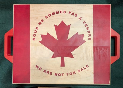 Serving board with the slogan "WE ARE NOT FOR SALE" dimensions: 31.5cm (12.5in) X 25.5cm (10 1/8in) X 2.5cm (1 1/8in) made of Canadian maple wood. On each side, plastic carrying handles printed on a 3D printer.